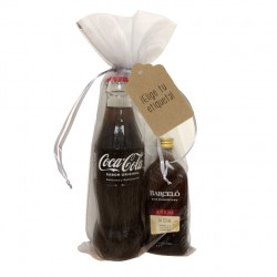 Detalle original para regalar a los amantes del RON-COLA. Compuesto por: - 1 Botellita de ron Havana Club - 1 Botella de cristal Coca-Cola Presentado en una bonita bolsa de organza de color dorado (si prefieres otro color, puedes elegir en blanco, rosa, rojo... o consúltanos). Y si quieres personalizarlo, selecciona la opción de añadir etiqueta...