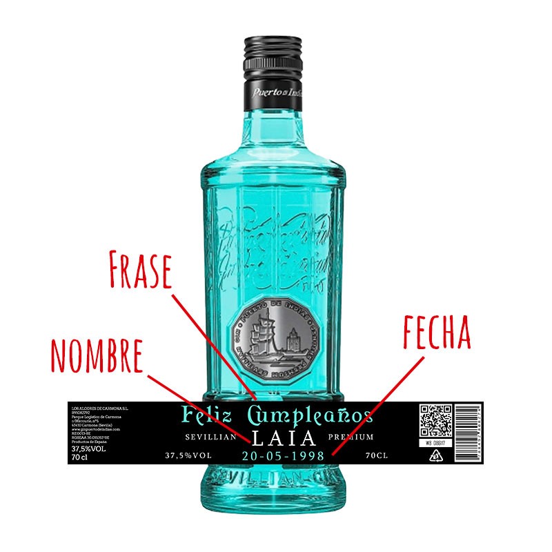 La Puerto de Indias classic es una ginebra ideal para regalar, el color llamativo de la botella hace que la personalización de la botella quede suuuper bonita. ¡100% a tu gusto! Adjunta el texto y creamos una botella única para ti.