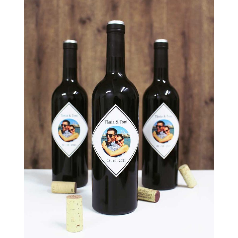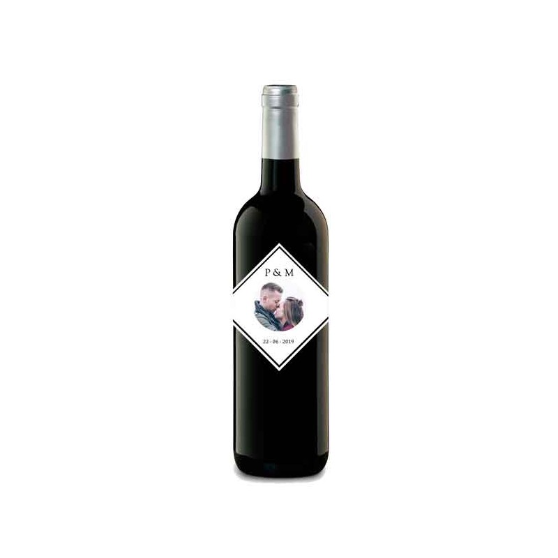 Anuncia la fecha de tu enlace de una forma diferente. Regala una botella de vino con este diseño de "Boda Minimalista". Es una excusa para que todo el mundo celebre brindando por vuestro amor. Solo con indicarnos vuestros nombres, la fecha de vuestra boda y mandarnos una foto vuestra... ¡Está hecho!