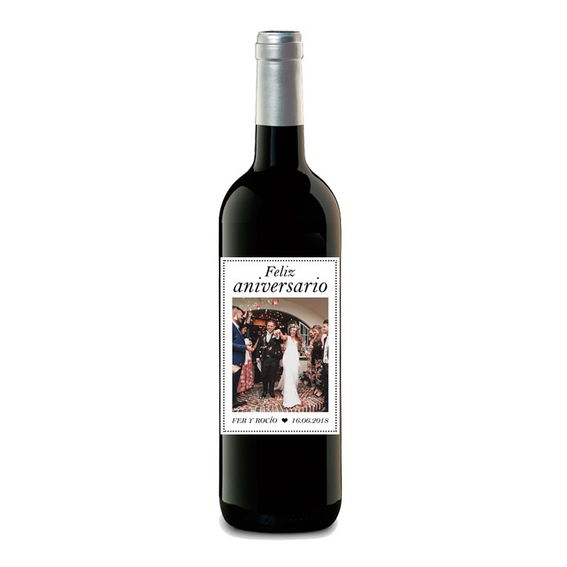 ¿Quieres celebrar el primer año de casados con vuestra propia botella de vino? Ahora podrás hacerlo con este diseño llamado "Feliz Aniversario". Sorprende a tu pareja en vuestro aniversario con un regalo original y personalizado. Esta botella sencilla y elegante será la encargada de haceros recordar ese día tan especial para los dos.