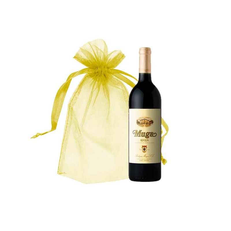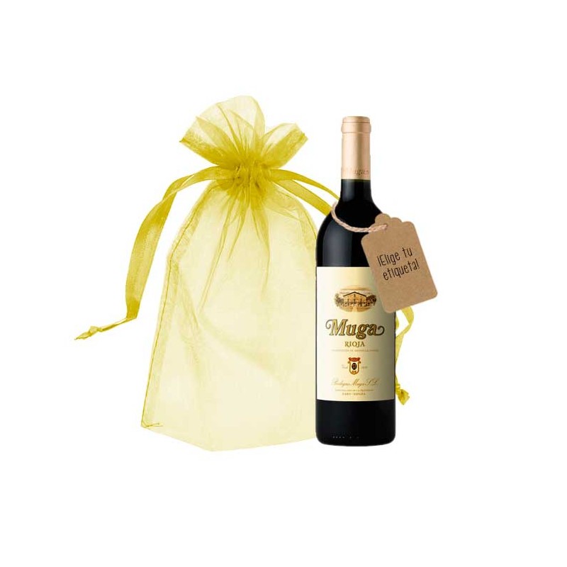 Botellita de vino Muga Crianza formato pequeño ideal para regalar en bodas y celebraciones (37,5 cl). Excelente y famosísimo vino tinto Rioja embotellado en botella pequeña de tres octavos. Un regalo que denota calidad. Puedes comprar la botellita de vino con etiqueta personalizada y una bolsita de decoración o la botella sola.