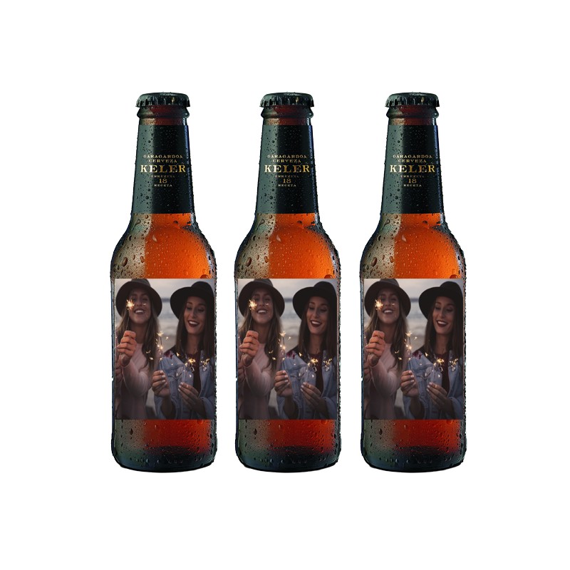 El botellín de cerveza que personalizamos es Keler, una cerveza que nació en San Sebastián con más de 30 premios internacionales.