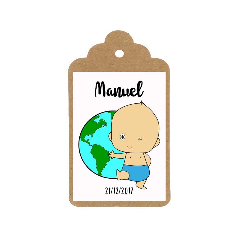 ¿Quieres mostrar tu bebe al mundo? Con la etiqueta personalizada de la bola del mundo tu bebe será el más viajero. Elige otro color del pañal y de fondo si lo prefieres, personalizamos las etiquetas para que el bautizo sea aún más especial.