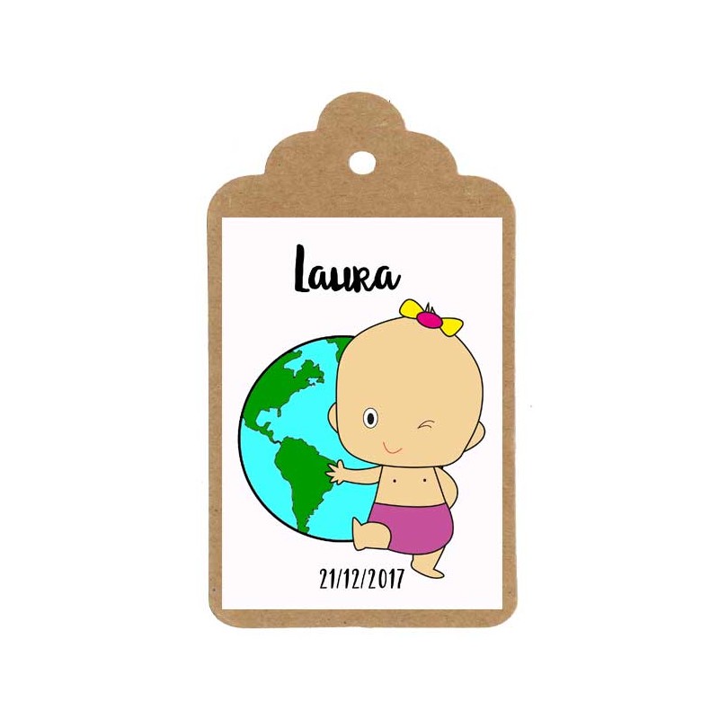 ¡Da la bienvenida a tu bebe al mundo! Incluye a las miniaturas que regales a tus invitados etiquetas personalizadas. Si eliges el diseño "Bautizo niña mundo" puedes seleccionar otro color de fondo o de pañal de tu niña para darle un toque especial al regalo.
