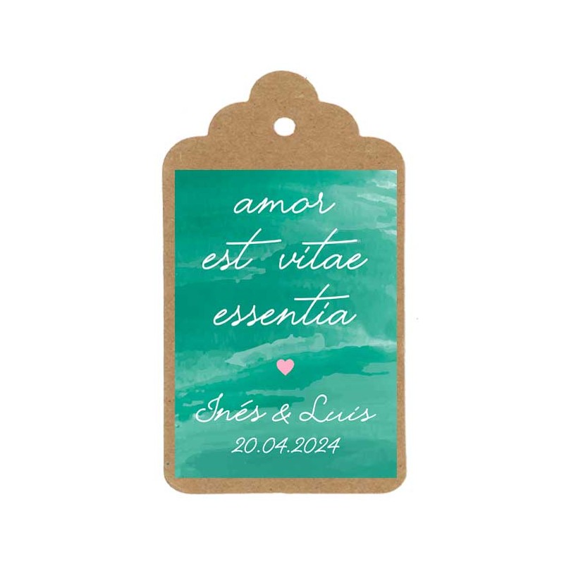 "El amor es la esencia de la vida". Eso es lo que dice esta etiqueta tan romántica y delicada. Podemos crearla en el color que quieras y con tu frase preferida. ¡Todo tiene que ser a tu gusto!