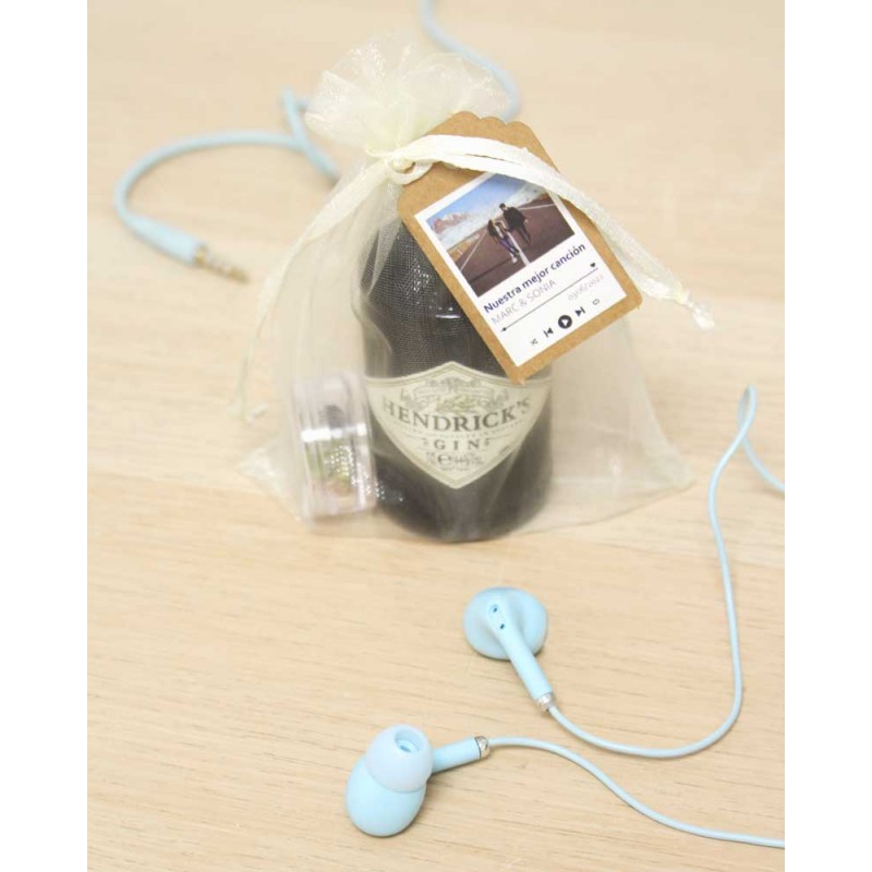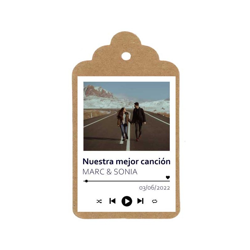 Personaliza tus miniaturas de licor con este diseño llamado "Nuestra mejor canción". Añadiremos vuestra foto preferida, nombres y fecha de la boda para completar la etiqueta. El diseño inspirado en Spotify que está tan de moda para regalos personalizados. ¡Y ahora en vuestra celebración!