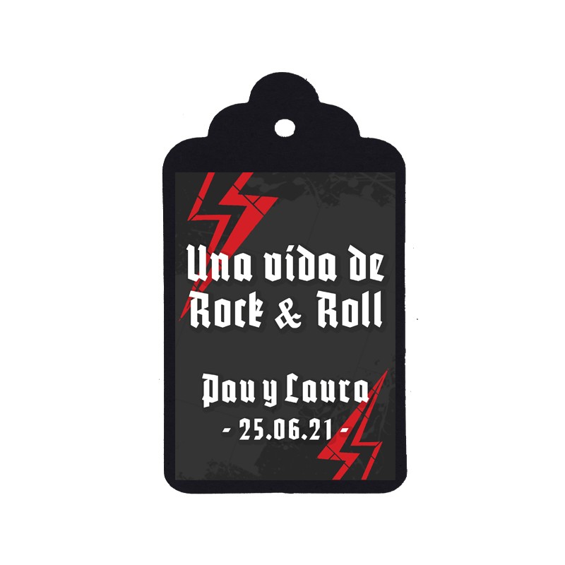 ¿Tú y tu pareja sois unos apasionados del Rock? Si la respuesta es sí, estáis tardando en personalizar las miniaturas de vuestra boda con esta etiqueta Nº49 "Rock&Roll". Añade la frase que quieras junto con vuestros nombres y la fecha de la boda. ¡Dará el toque de Rock&Roll a vuestro día!
