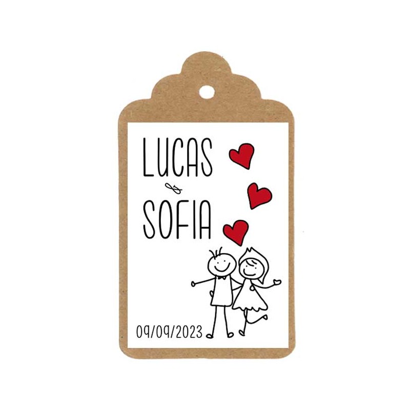 Una simpática etiqueta con vuestros nombres y fecha de la boda. Ideal para parejas jóvenes, divertidas y desenfadadas.