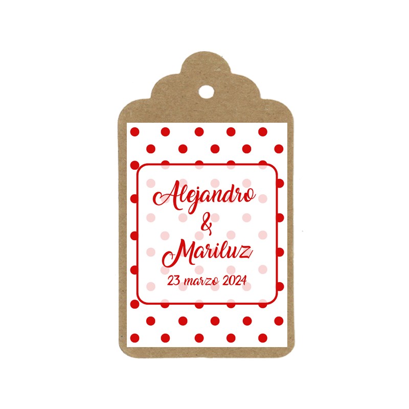Elige la etiqueta personalizada de boda más flamenca. Un diseño de lunares para el bodorrio que estás organizando.