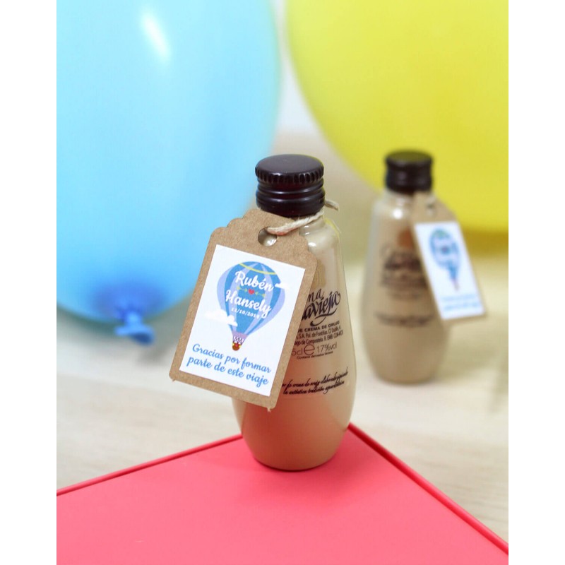 Queremos que subáis a las nubes con esta etiqueta personalizada "AMOR EN GLOBO". Un diseño azul muy romántico y dulce para adornar las botellitas de vuestro licor favorito.