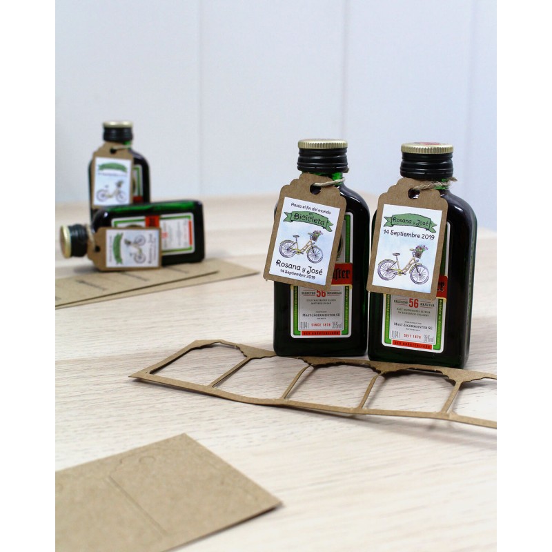 Os presentamos la etiqueta ideal para que vuestra boda vaya sobre ruedas: "AMOR EN BICICLETA". Recordad las maravillosas aventuras que habéis vivido encima de ella y elegidla como la protagonista del regalo personalizado para vuestros invitados. Al ser tan colorida y alegre combina genial con todas nuestras botellitas, ¡será un acierto seguro!