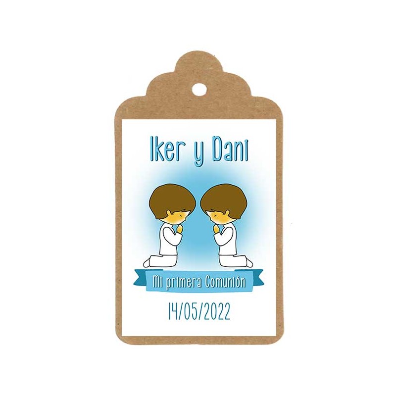 ¿Has visto las mini botellitas de licor tan bonitas que tenemos en Etiqueta Voltereta para la comunión de tus hijos? Ese día tiene que ser especial para ellos y todo tiene que salir perfecto. ¡Hasta el regalo de tus invitados! No te preocupes, lo prepararemos con mucho mimo. Pero ¿Tus hijos son mellizos o gemelos? ¡No hay ningún problema, disponemos de esta simpática etiqueta personalizada para que los dos sean protagonistas ese día.