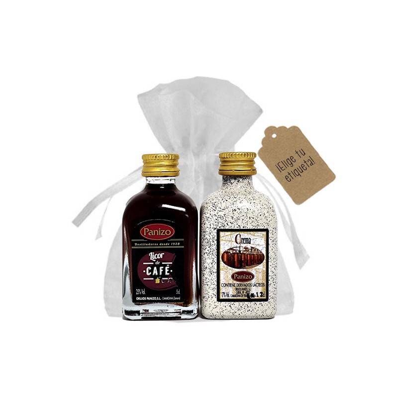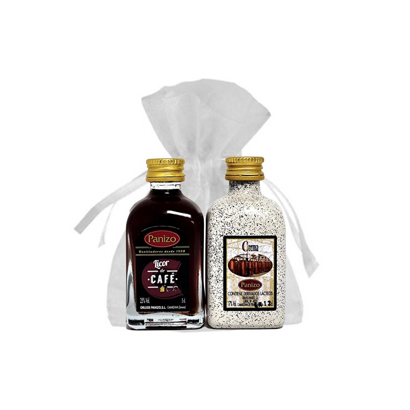 Cada pack incluye dos botellitas de licor en miniatura: una de Crema de orujo Panizo y otra de Licor de Café Panizo, ambas con todo el sabor y la calidad de una marca reconocida. Las miniaturas vienen presentadas en una bolsa de organza, lo que aporta un toque sofisticado y listo para regalar.