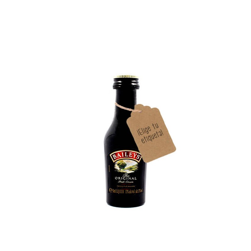 Puedes añadir una etiqueta personalizada y bolsita de color a la botellita de Baileys con el diseño que más te guste, elige una de nuestra SELECCIÓN DE ETIQUETAS PARA BOTELLITAS PERSONALIZADAS.